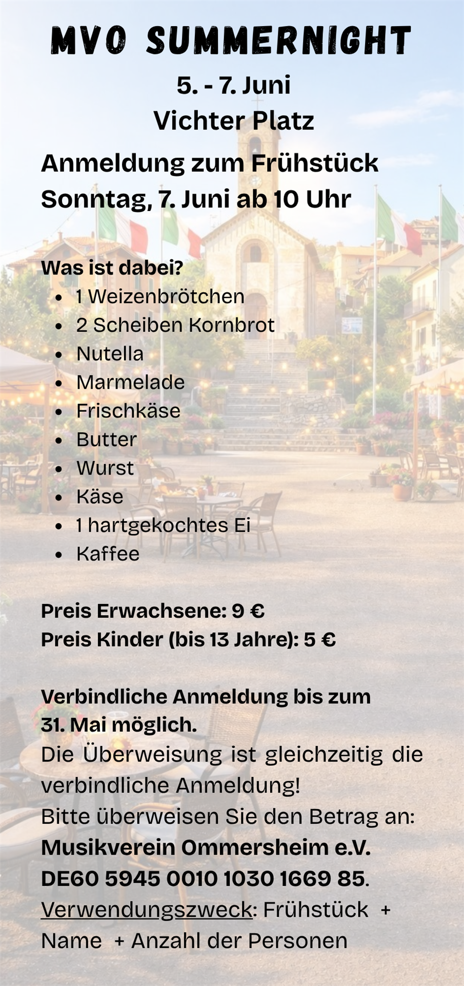 Mit der Veranstaltungsreihe „MVO Summernight“ entsteht ein sommerlicher Treffpunkt, der Musik, Gemeinschaft und Genuss auf besondere Weise verbindet. Der Musikverein möchte damit einen neuen kulturellen Höhepunkt im Jahreskalender etablieren und zeigen, wie lebendig und verbindend Musik im Dorf wirken kann. Drei Tage voller Musik, Genuss und italienischem Flair – ein Sommerhighlight, das man nicht verpassen möchte.